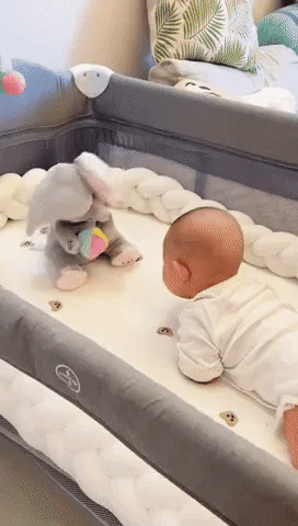 Terwijl de muziek speelt, bewegen de zachte oortjes op en neer en bedekken ze speels de oogjes – veilig en grappig tegelijk.